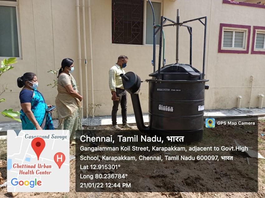 It is in the canteen to produce biogas from the food and vegetable wastage which is being used for cooking.