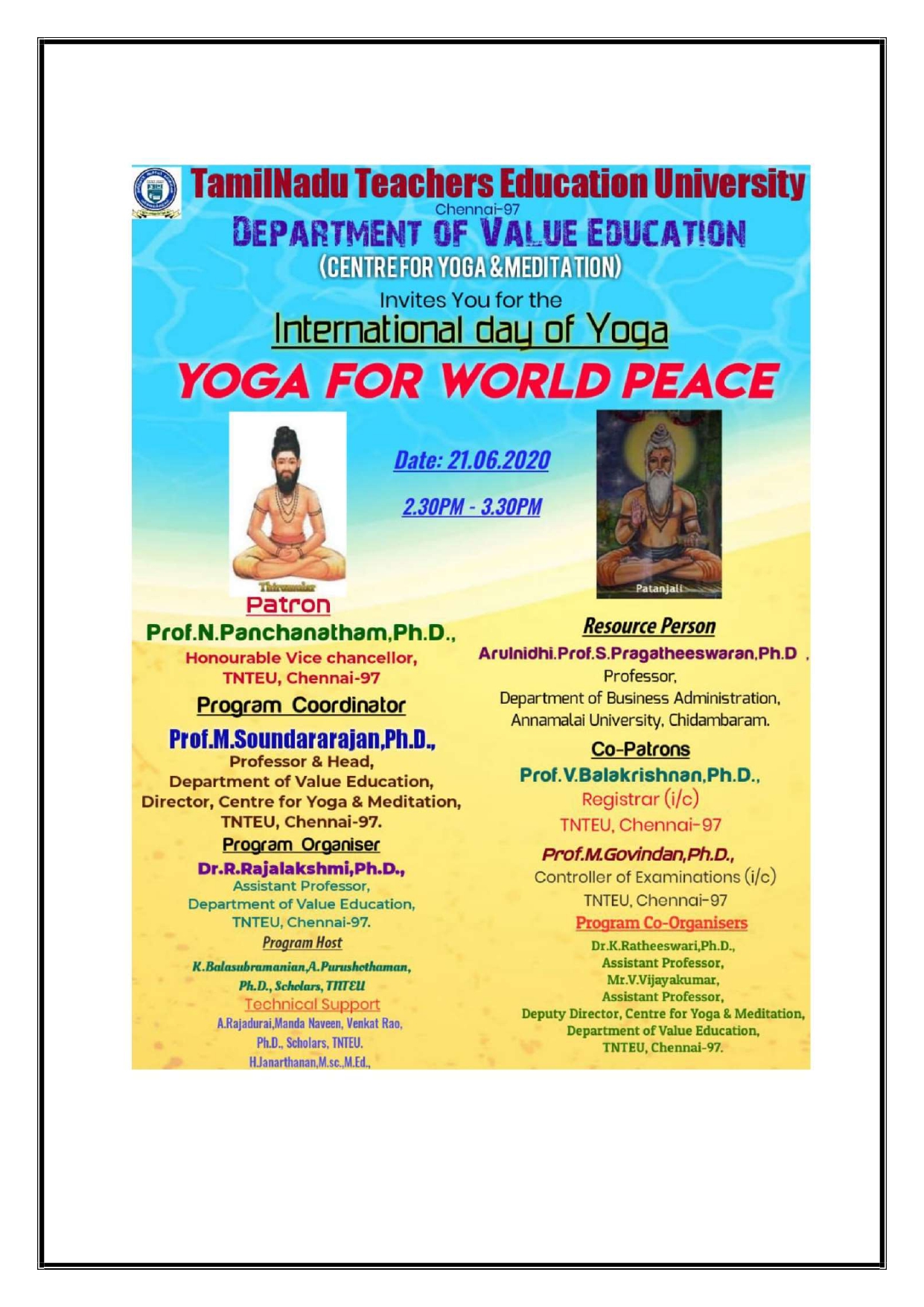 The Center for Yoga and Meditation of TNTEU has been functioning well by organising various Programmes related to Yoga and Meditation activities in collaboration with other institution and agencies at Government and Non-Government level by mobilization the resources each other mutually. The process of signing MoU’s at regional, national and international entities is underway.